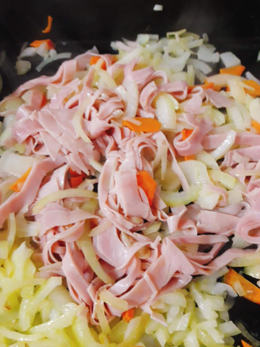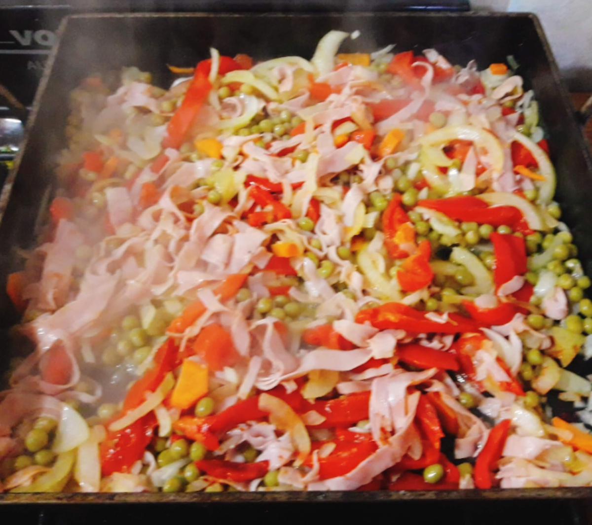 Pelar y cortar las papas en baston, dejar unos minutos en agua fría para que suelten el almidón y queden más crocantes y luego freir, te dejo este link Cómo hacer para que tus papas fritas queden crocantes y doradas, colocar en una fuente con papel absorbente y reservarEn una sartén o plancheta , derretir la manteca , incorporar la cebolla cortada pluma o como prefieras, y los morrones en tiritas, puedes agregar ajo picado si te gusta, cocinar unos minutos hasta que estén tiernos, y añadir el jamón cortado en tiritas, y las arvejas, condimentar con sal, pimienta y pimentón, y cocinar unos minutos