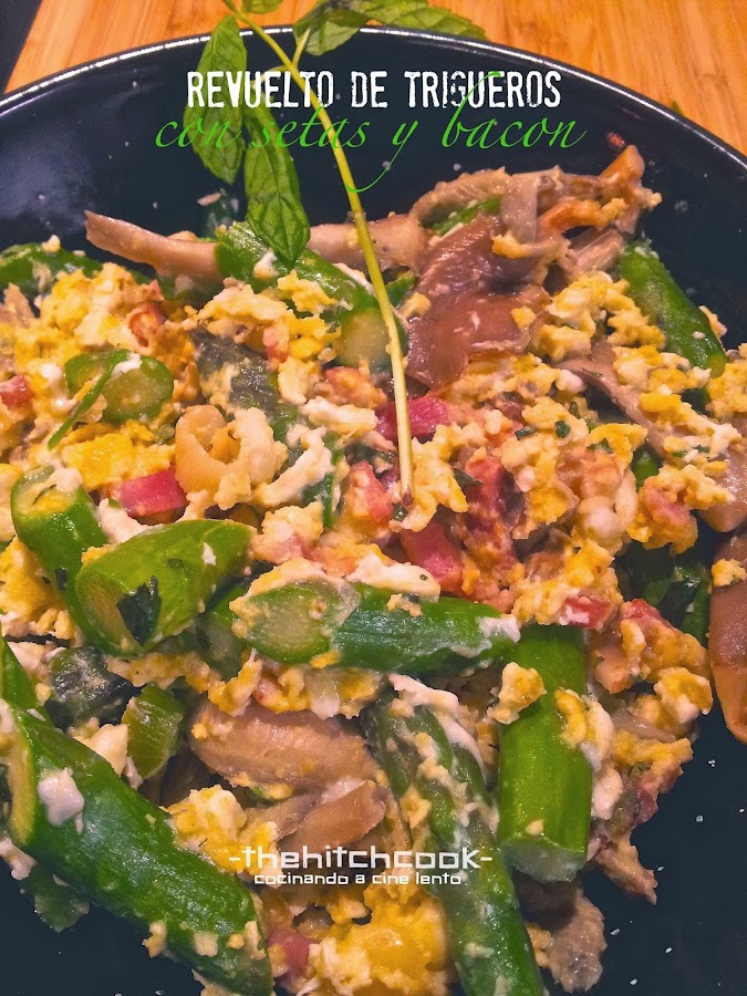 Este revuelto también lleva trigueros, pero los combina con otros ricos sabores para darnos un resultado totalmente diferente y delicioso. Se trata de un revuelto de trigueros con setas y bacon, del blog The Hitchcook.