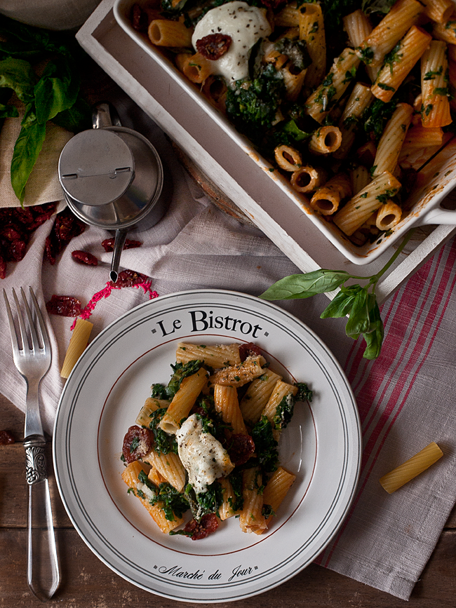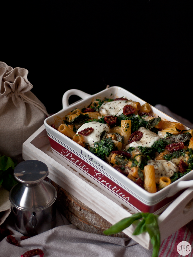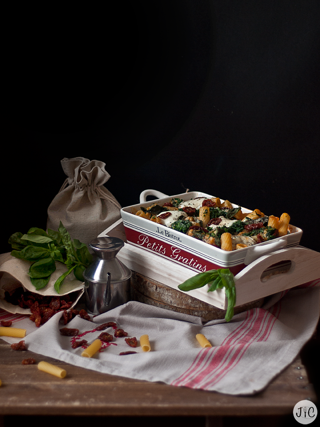 Es una receta que se me ocurrió después de que mi amiga Ana me trajera un bolsa de tomates secos de Italia (pomodori secchi). Tenía que aprovechar para hacer una receta con esos deliciosos tomates secos y antes de que me los acabara... ¡estaban tan buenos que me los comía como pipas... literal! Tenía que hacer algo y se me ocurrió preparar un plato con rigatoni al horno. Me encanta este tipo de pasta al horno y por eso me animé a preparar esta receta.