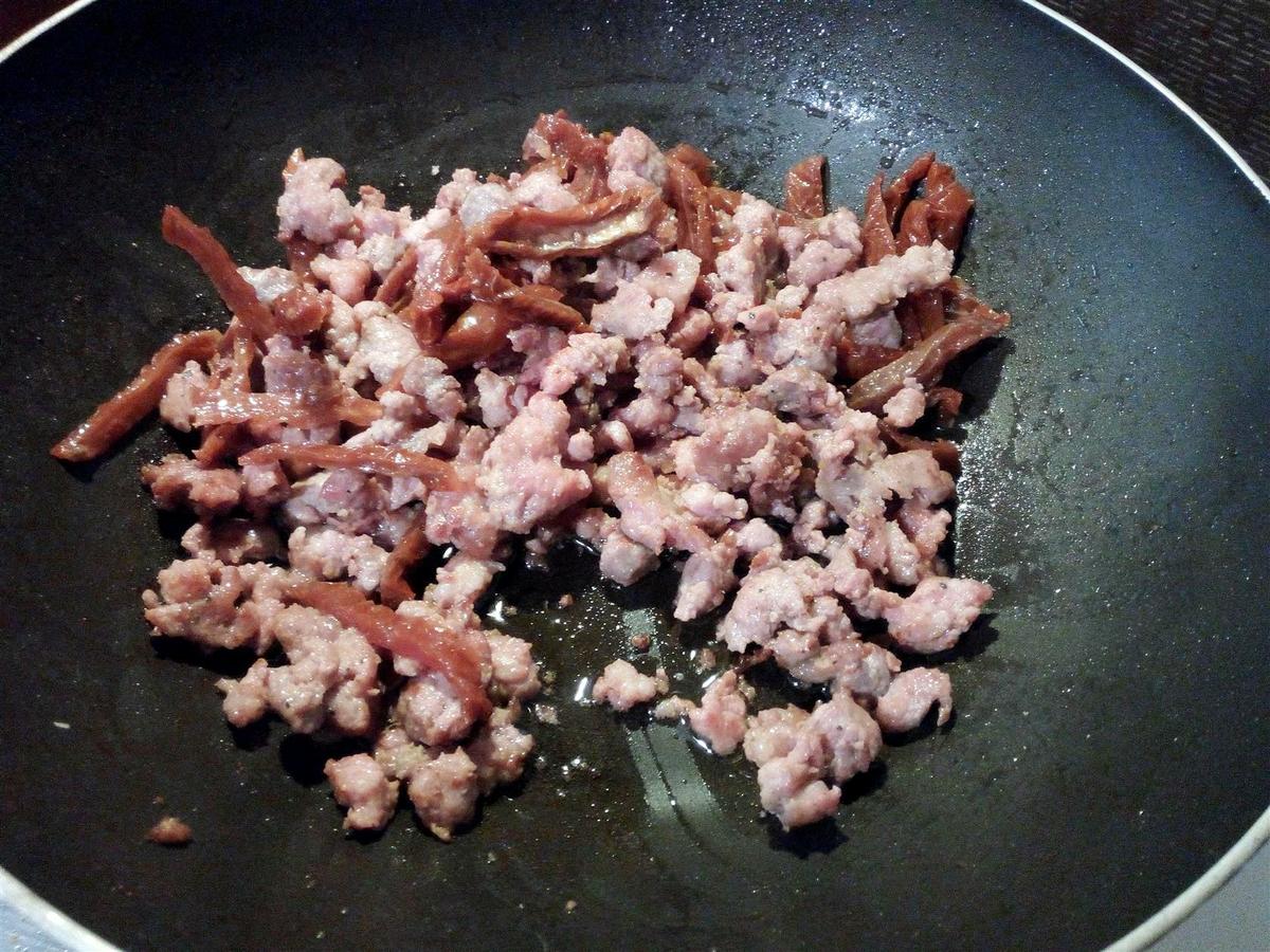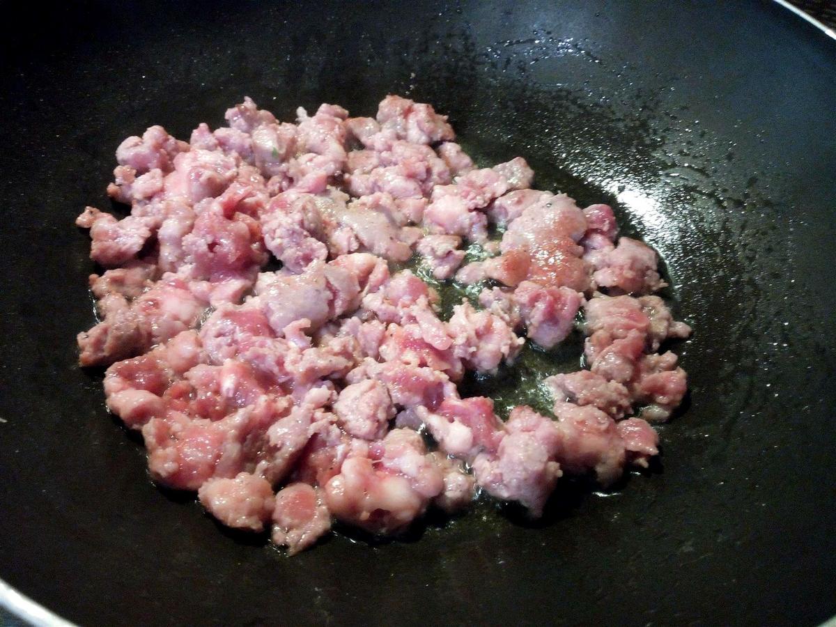 Poner la olla con el agua a hervir. En una sartén, con un poco de aceite, dorar el chorizo desmigado y sin piel.