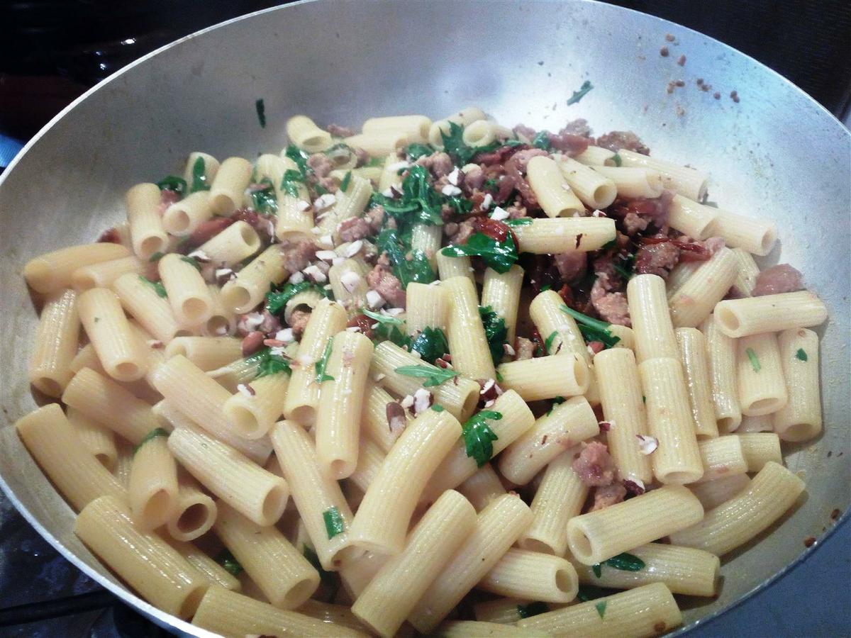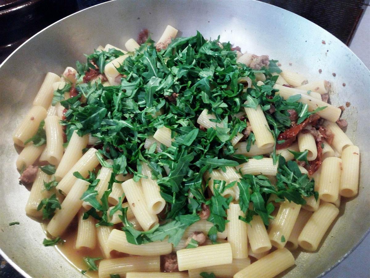 Escurrir la pasta al dente y volcar en la sartén, junto con rúcula picada.