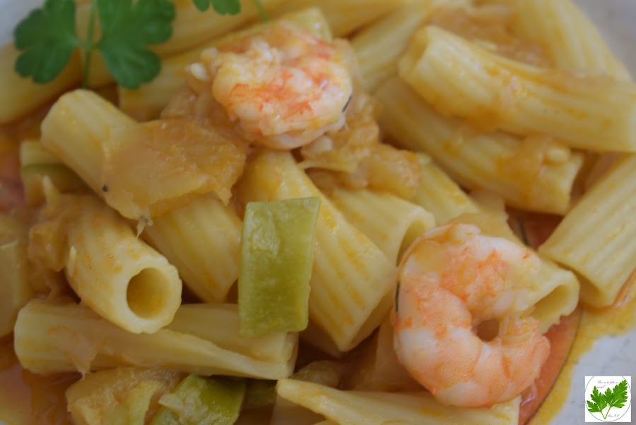 Empezamos la semana cocinando rico y con gusto. Si me acompañas durante un ratito, prepararemos juntos estos rigatoni con langostinos y manzana. El resultado es excelente y probarla todo un placer.
