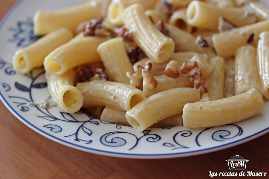 Mientras se cuece la pasta, preparamos la salsa, ponemos la mitad de la nata (crema de leche) (aproximadamente 50g.) en una cacerola y a fuego suave. Añadir el gorgonzola cortado en trozos , dejar para que se vaya derritiendo (en 1-2 minutos ) e incorporando con la nata (crema de leche). Añadir las nueces, mover ,bajar el fuego y dejar espesar la salsa. Reservamos, para diluirla cuando lo mezclemos con la pasta.