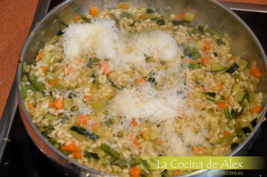 En el último momento, cuando incorporamos el último cazo de caldo vamos a poner también nuestro que rallado, esto le dará mucha melosidad a nuestro risotto.