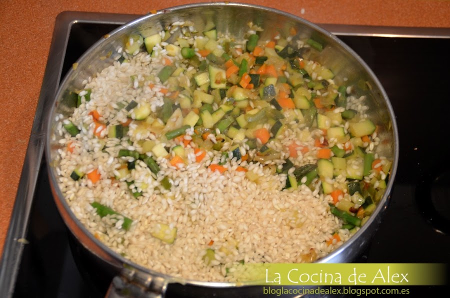 Lo siguiente que incorporamos es el arroz que rehogamos con todas las verduras unos minutos, al cual vamos a ir añadiendo nuestro caldo (cuando este hirviendo) poco a poco, es decir, ponemos un cazo de caldo removemos hasta que no quede nada, volvemos a incorporar otro cazo, así hasta que el arroz este en su punto, siempre sin dejar de remover en todo momento.