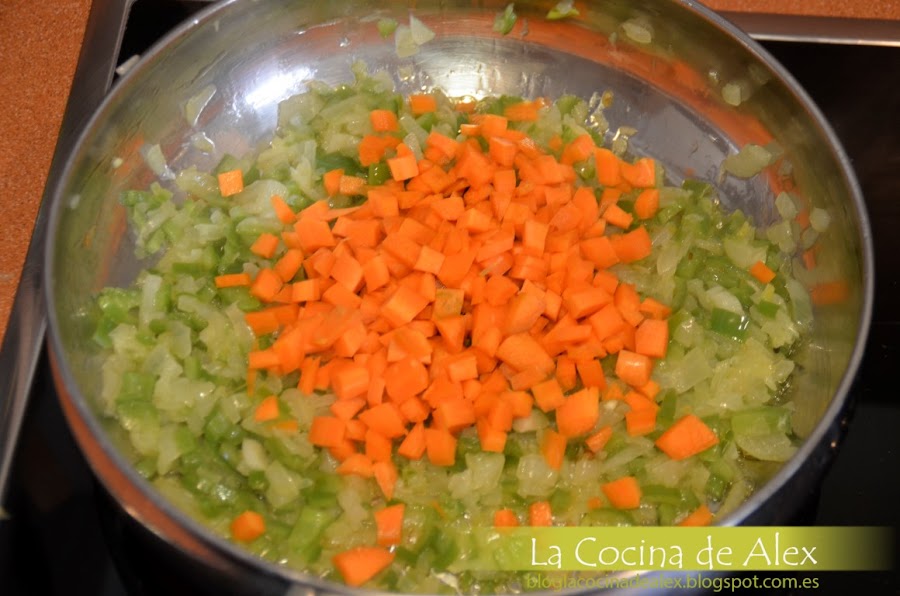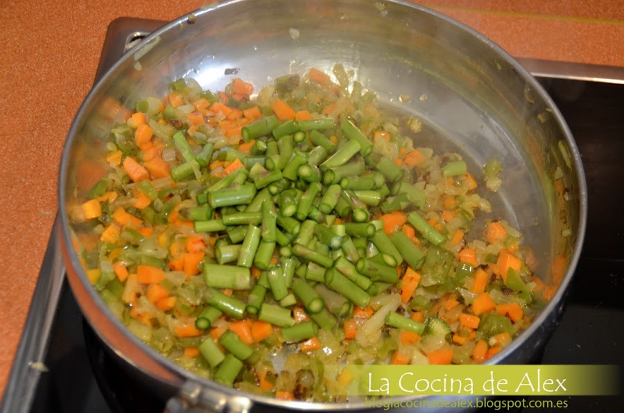 Lo siguiente que agregamos es la zanahoria, y los espárragos que también pochamos todo en conjunto hasta que este bien pochado y un poco tierno, no hace falta que este cocinado del todo ya que luego va a hervir.