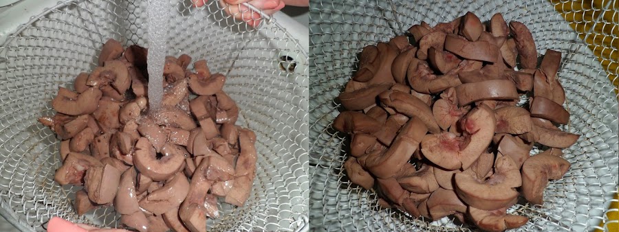 Volteamos los riñones en un escurreverduras y pasamos por el grifo del agua moviéndolos para que se laven bien. Esta operación es importante realizarla a fondo para que el agua arrastre todas las impurezas.
