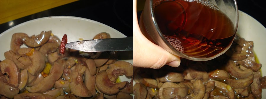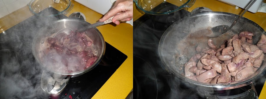 Inclinamos la rustidera o sartén y con una cuchara de servir vamos quitando todo el caldo que desprende y tirándolo (lo podemos echar en el bol donde estaban los riñones anteriormente), seguimos rehogando y quitando todo el líquido que desprendan hasta que no salga más líquido.