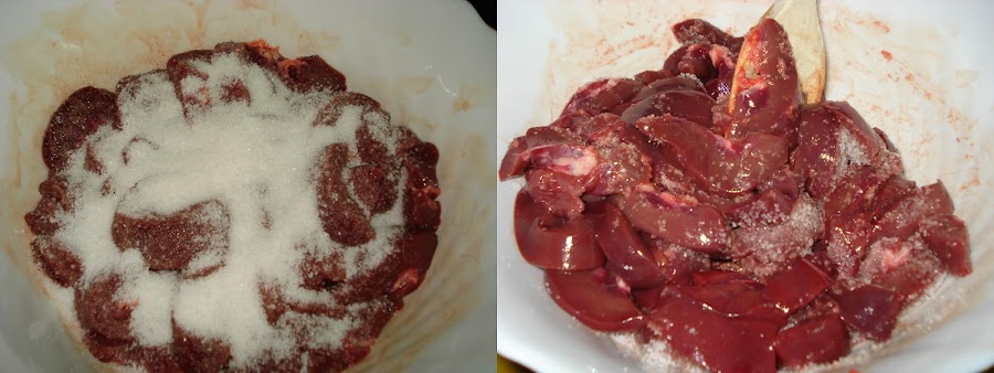 Colocamos todos los trozos de riñones en un bol y les añadimos abundante sal gorda, los removemos y dejamos reposar una hora, removiendo de vez en cuando.