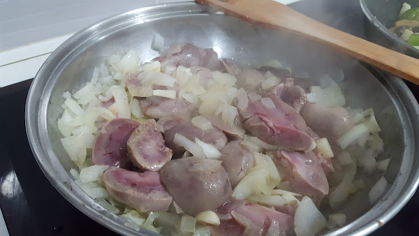 5.- Ahora lavamos los riñones que teníamos a remojo y los echamos a la sartén con la cebolla y los ajos. Vamos moviendo la mezcla con cuidado, de vez en cuando, para que no se queme.