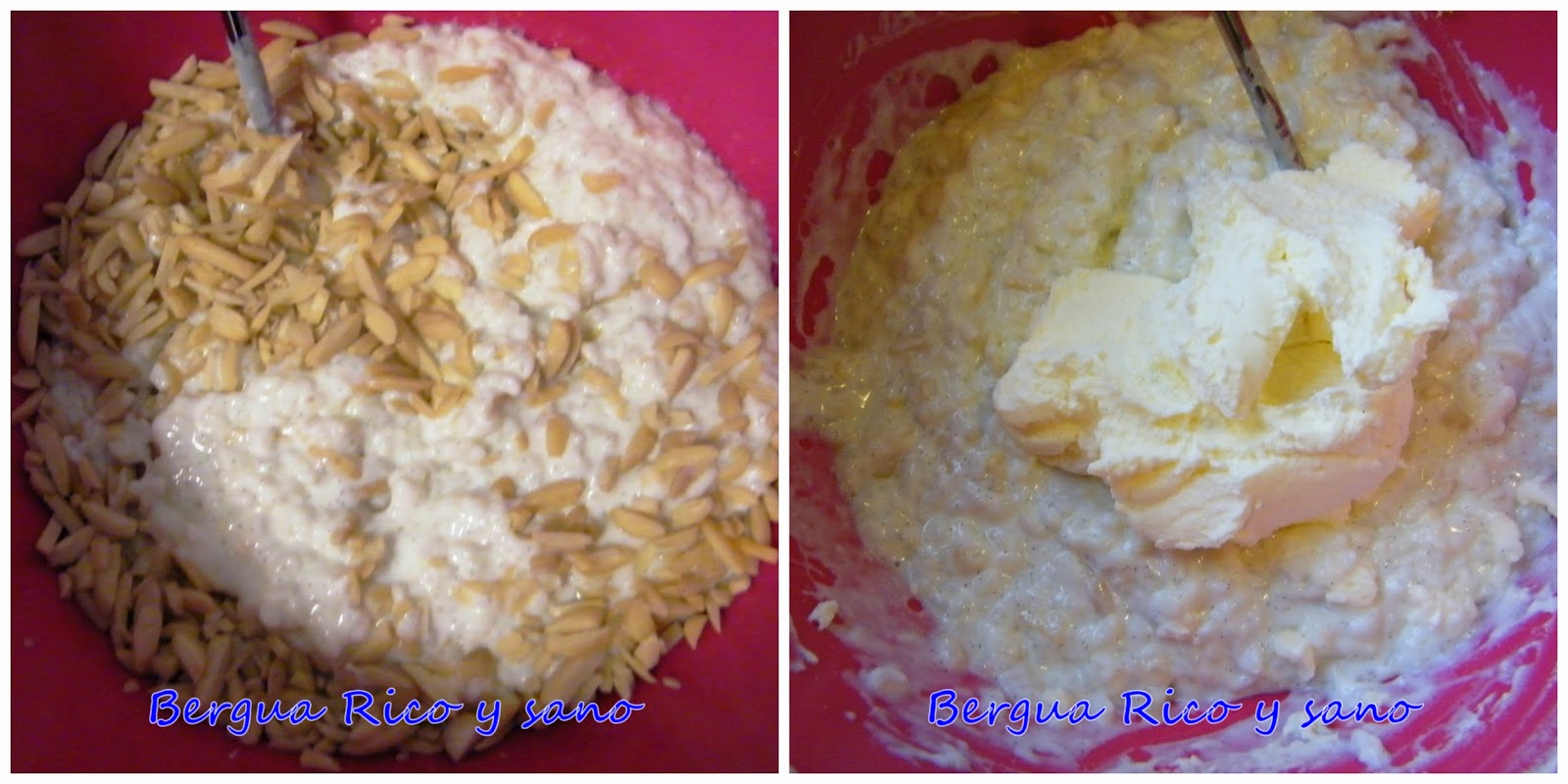 4. Ya fría la gacha, seguimos: Guardamos una almendra entera y las otras las troceamos. Las añadimos a la gacha de arroz y mezclamos bien.