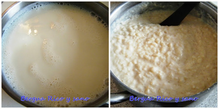 2. Entonces añadimos la leche y las semillas de la vaina de vainilla y volvemos a llevar la mezcla a ebullición. Cuando de el primer hervor, bajamos a fuego lento y removemos durante 10 minutos. Después tapamos la olla y le damos 30 minutos más de cocción a fuego lento. De vez en cuando removemos y controlamos que no se pegue.