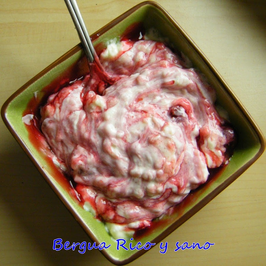 5. Entonces batimos la nata (crema de leche) junto con el azúcar glas y la mezclamos con cuidado con la gacha de arroz. Reservamos al frío durante 1-2 horas. En ese tiempo se espesará más.