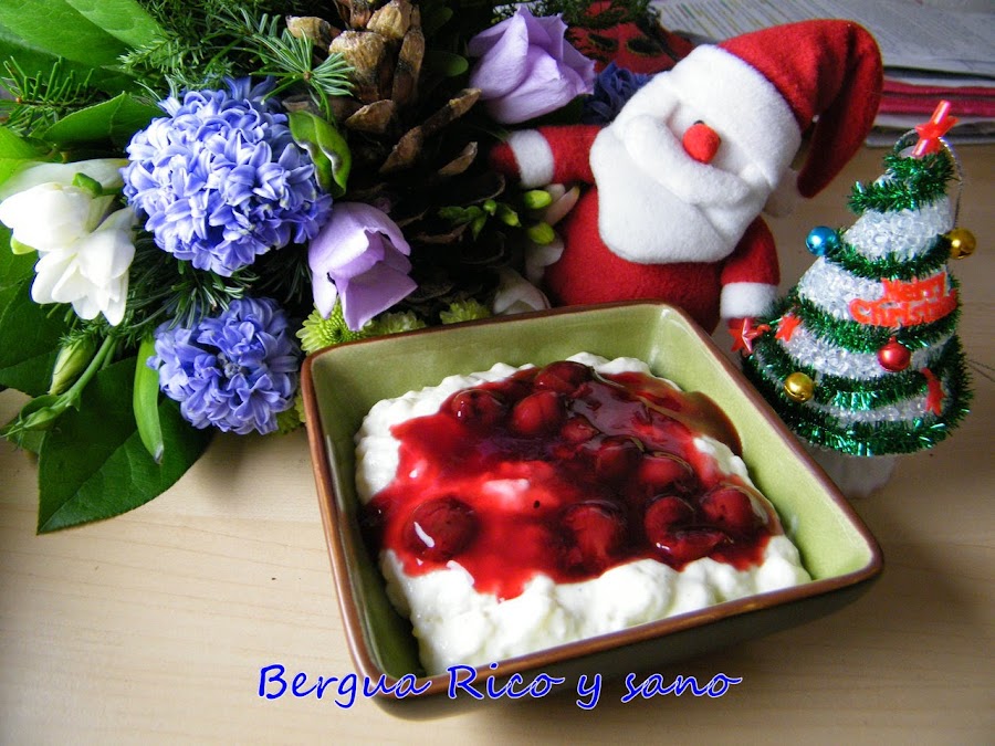 8. Ya sólo nos queda servir el risalamand bien frío y rociar con la salsa de cereza calentita. ¡A ver si te toca la almendra!