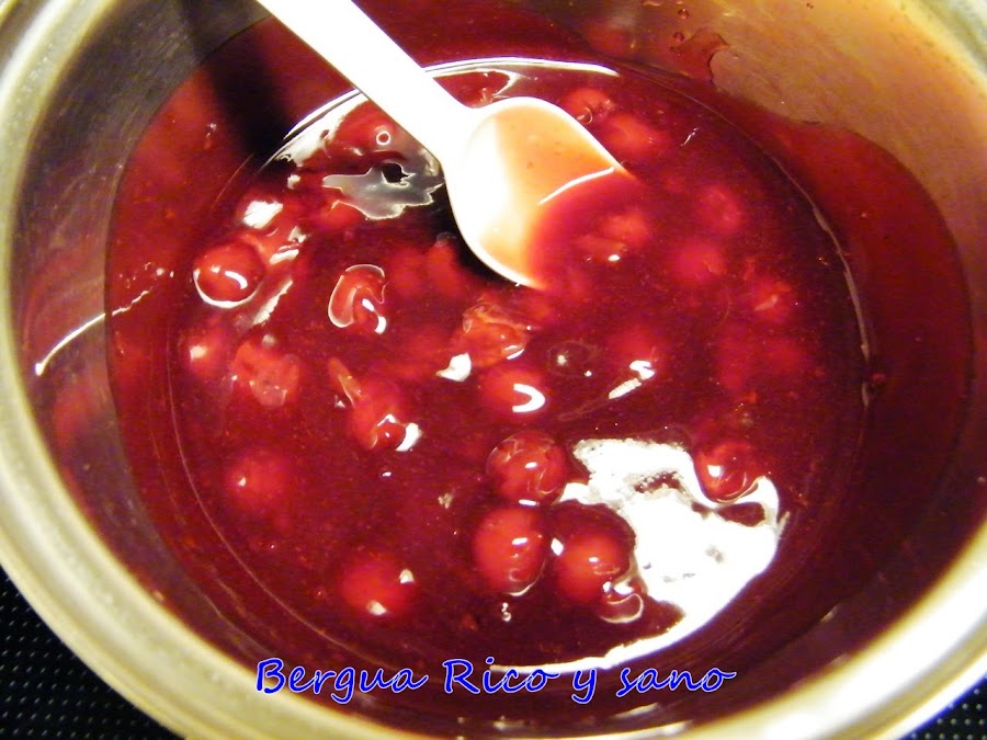 7. Echamos a una olla las cerezas, el resto del zumo y el azúcar. Lo llevamos a ebullición y entonces añadimos la mezcla de maizena y zumo. Le damos 5 minutos al fuego y retiramos.