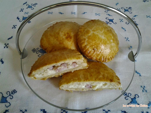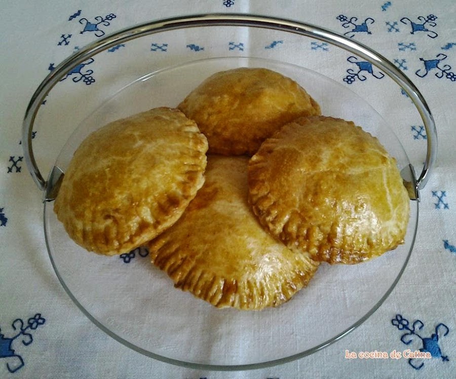 En el centro de estos colocamos una cucharadita de relleno, pintamos los bordes con huevo batido y cubrimos con otro disco de masa, sellando los bordes con las púas de un tenedor. Pintamos por encima con huevo batido y metemos al horno precalentado a 190 grados durante 20 minutos.