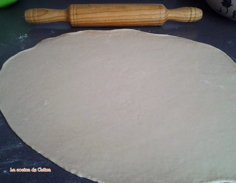 Cubrimos la mesa de trabajo con un espolvoreo de harina, colocamos la masa y la estiramos con el rodillo dejándola fina.