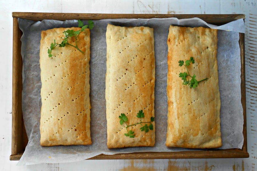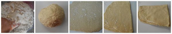 Ponemos en un bol la harina tamizada con la levadura y la sal. Agregamos 75 gr. de mantequilla troceada incorporandola con los dedos hasta obtener una masa arenosa, (los 50 gr. de mantequilla que nos quedan, los usaremos derretidos para pintar la masa). Añadimos el agua y mezclamos hasta obtener uan masa que no se pega a los dedos. Estiramos sobre la encimera (mesada) enharinada dandole forma rectangular. Untar con la mitad de la mantequilla derretida y espolvorear con harina. Doblar por la mitad y volver a pintar con la mnetqeuilla restante y espolvorear con harina.