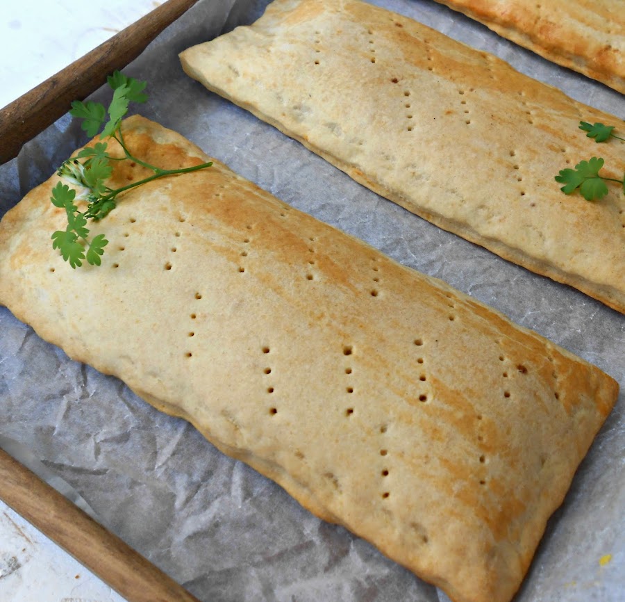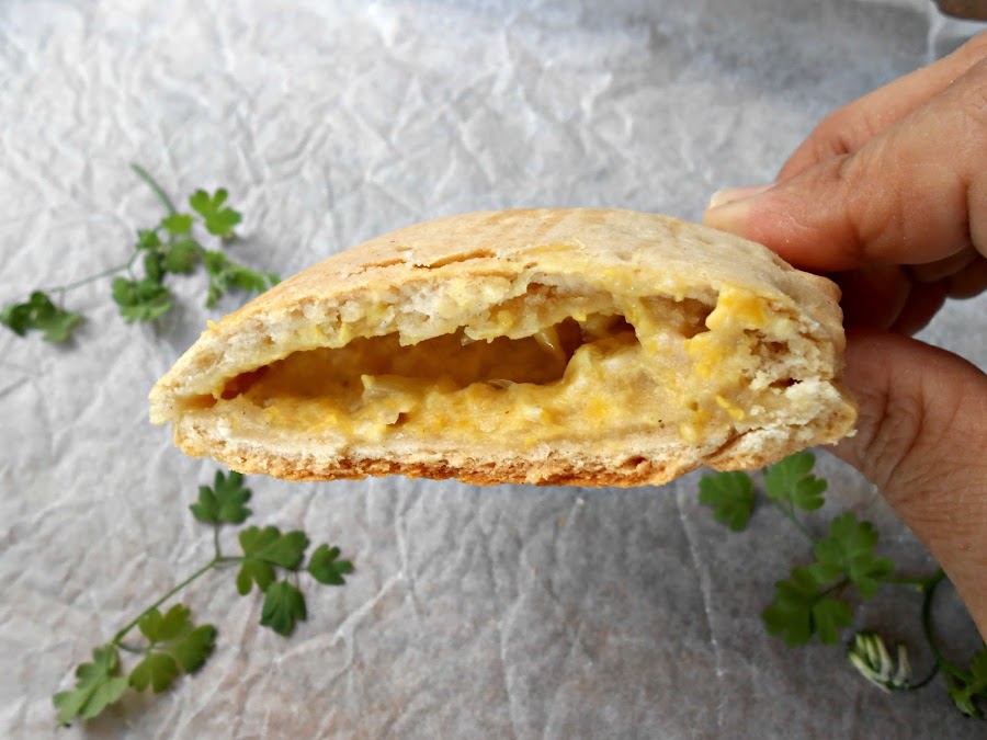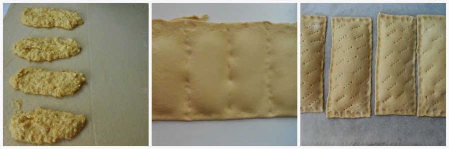Estiramos la masa con rodillo dandole forma rectangular, la dividimos en dos, sin cortarla y sobre una mitad colocamos 4 porciones de relleno, cubrimos con la otra mitad de la masa uniendo bien los bordes. Cortamos y pinchamos con un tenedor para que pueda salir el vapor de la cocción. Pintamos con leche y cocinamos a 180º durante 20 minutos o hasta que esté dorada la masa. Recuerden que cocino en un horno a gas con calor sólo de abajo y en la rejilla central.