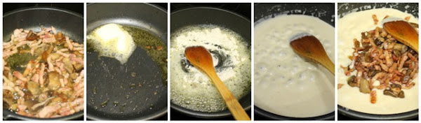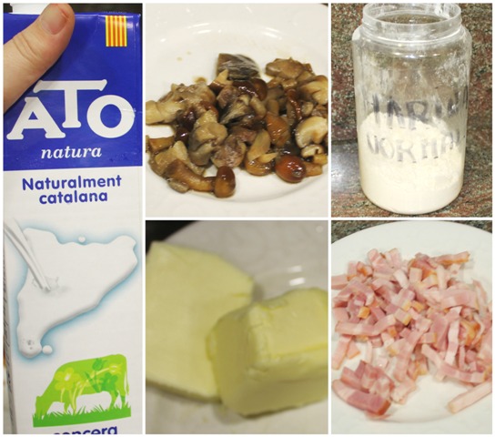 En la misma sartén añadiremos la mantequilla, y la tendremos hasta que se deshaga, momento en el cual añadimos la harina. Mezclamos y rehogamos durante 2 minutos y, posteriormente, iremos añadiendo la leche poco a poco, removiendo constantemente (si, lo habéis descubierto, estamos haciendo una bechamel), cuando tengamos la bechamel bien hecha retiramos del fuego y añadimos las setas y el bacon que teníamos reservado, mezclamos y reservamos.