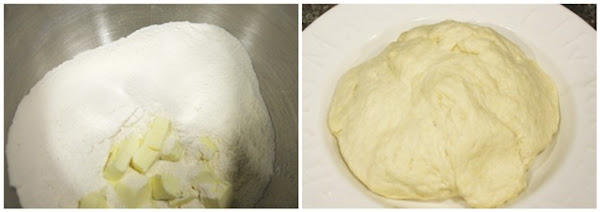 Tamizamos la harina junto con la sal y la levadura. Añadimos la mantequilla fría, que habremos partido en cuadrados, y mezclamos bien, hasta que parezca una arenilla fina.