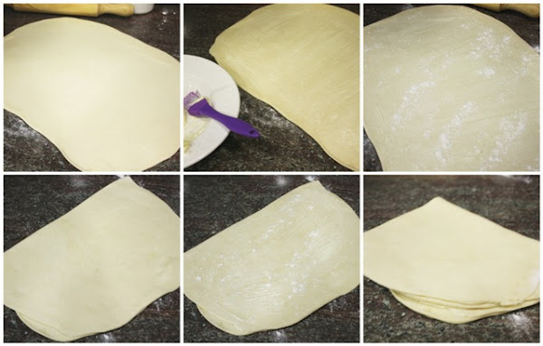 Cuando la tengamos bien estirada pintaremos toda la superficie con mantequilla (con ayuda de un pincel) y le ponemos un poquito de harina espolvoreada por toda la superficie.