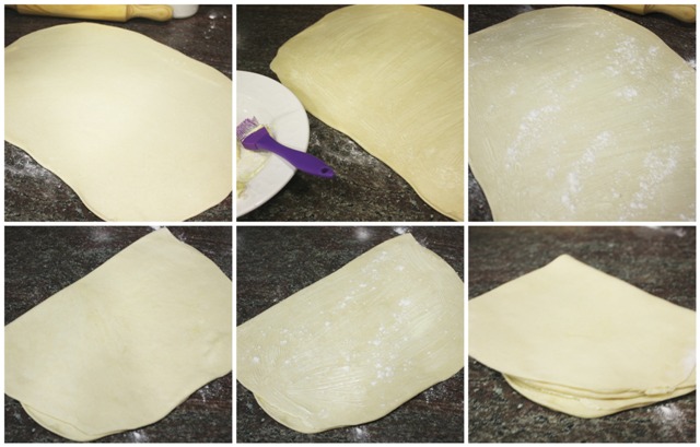 La doblamos por la mitad y volvemos a pintar la nueva superficie con mantequilla y espolvoreamos con harina.