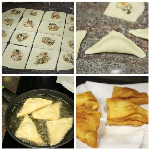 Iremos formando cuadrados de 10 x 10 cm aproximadamente, y les ponemos en en centro de cada uno de ellos un poco del relleno que teníamos reservado, untamos los bordes con agua y lo cerramos formando un triángulo.