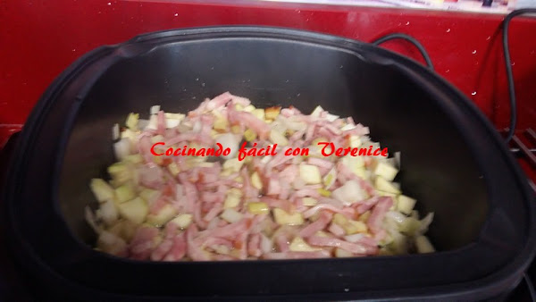 Introducimos el bacon a pedacitos también y seguimos dándole unas vueltas, a éste ingrediente no le hace falta tanto tiempo porque ya está ahumado.