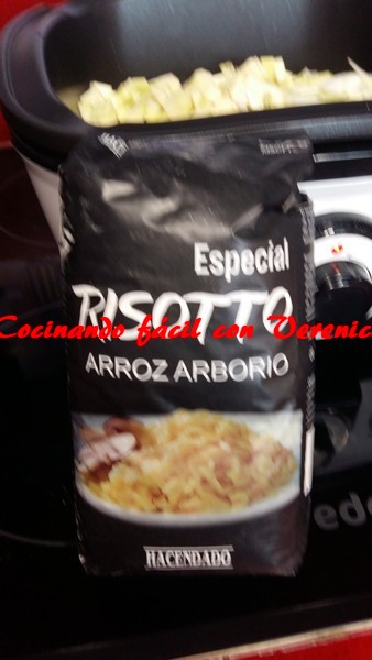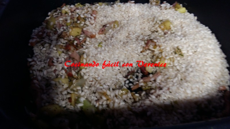 Terminado el salteado ponemos en la cubeta 400 gramos de arroz arborio. Este arroz es una variedad de grano blanco, redondo, corto y que absorbe gran cantidad de líquido sin ablandarse demasiado y de la más famosa de Italia, usándola los mejores chefs para sus risottos. Si no tenemos a mano este arroz podemos utilizar otro de grano redondo, no tendrá el mismo ni textura y habrá que mover más el arroz para que no se pegue pero siempre podrá quedar un buen risotto.