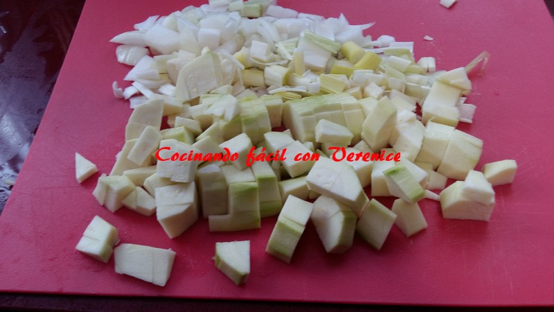Se limpia, lava y trocea en pequeños trozos el calabacín y la cebolleta.
