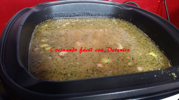 Llegado el momento de añadir el fumet de verduras tengo que aclarar: casi siempre tengo fumet de verduras, carne o pescado en el congelador. Ya que suelo hacer grandes cantidades y siempre me sobra. En ésta ocasión no fue diferente, lo tenía hecho pero si os encontráis en la circunstancia de que no lo tenéis podéis usar un caldo de verduras comprado hecho.