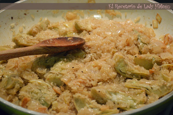 En otra sartén más grande añade 1/3 de la mantequilla y un chorrito de aceite. Espera a que la mantequilla esté deshecha para añadir la cebolla y el ajo picado. Cuando la cebolla esté tierna y un poco dorada, añade la alcachofa cortada.