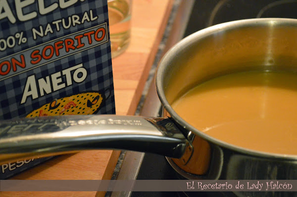 Caldo para paella con sofrito de Aneto (6,70 ?)Este caldo de pescado y marisco con sofrito me ha sorprendido mucho por que ¡estaba muy rico y no sabía a polvos! (es decir, a ingredientes artificiales). Lo probamos mientras preparábamos el risotto, tenía un color anaranjado espectacular y un sabor a pescado y marisco muy rico, aunque con los ingredientes que lleva no es de extrañar. Para el caldo: agua, rape (32%), cebolla, zanahoria, apio, puerro, tomate, bacalao (2%), hinojo y sal marina. Y para el sofrito, que es un 20%: pescado de roca y marisco 31% (congrio, cabracho, cintas, cangrejo, mejillón y gamba), tomate, cebolla, aceite de oliva virgen, vino blanco, ajo, ñora, pimentón de la vera y azafrán. Vamos, que en casa no se nos hubiera ocurrido preparar un caldo así en la vida jajaja. Muy recomendable ya que puede sacar de un apuro más de una vez.