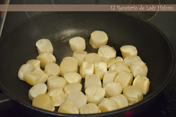 Pica la media cebolla y los ajos.En una sartén a fuego medio y con un poco de aceite de oliva, rehoga las gambas, retíralas y en la misma sartén rehoga también las vieiras. Retíralas de la sartén y reserva.