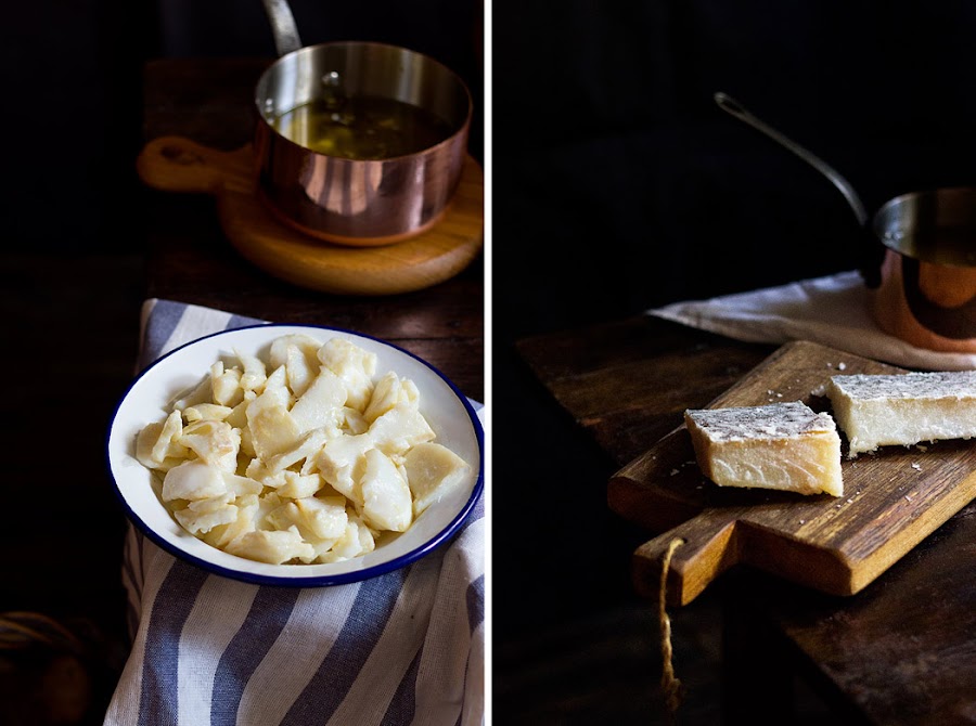 Desalamos el bacalao siguiendo las instrucciones del fabricante. Una vez desalado, secamos bien y ponemos en un cazo cubierto de aceite con un diente de ajo alrededor de 20 minutos a baja temperatura para confitarlo. Sacamos a un plato y una vez templado, separamos en lascas y reservamos.