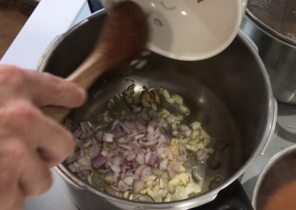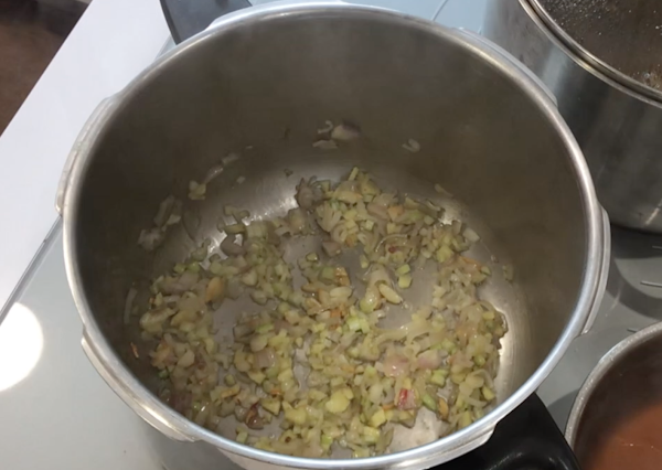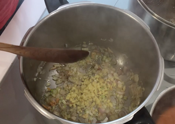 Ponemos ahora en nuestra cazuela el jengibre fresco picado.