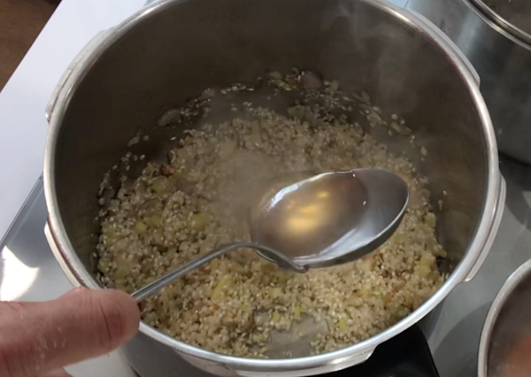 Cocemos el arroz durante 15 minutos, cada minuto incorporamos un cazo de servir de caldo caliente.