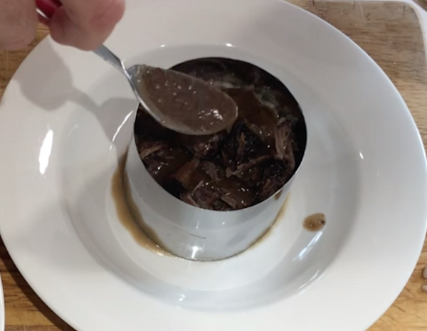 Sobre todo ponemos una cucharada de salsa de cocción del rabo de toro.