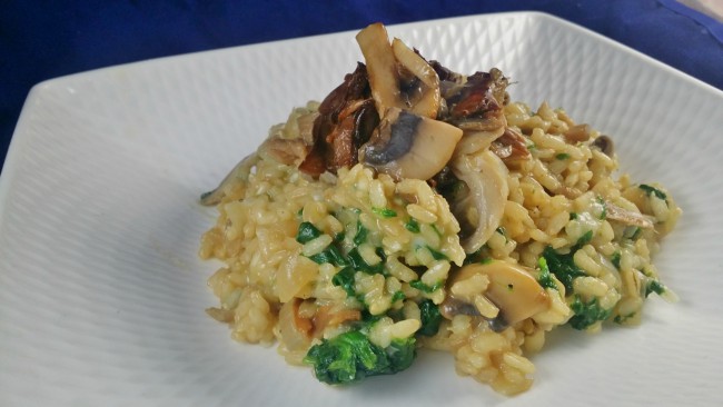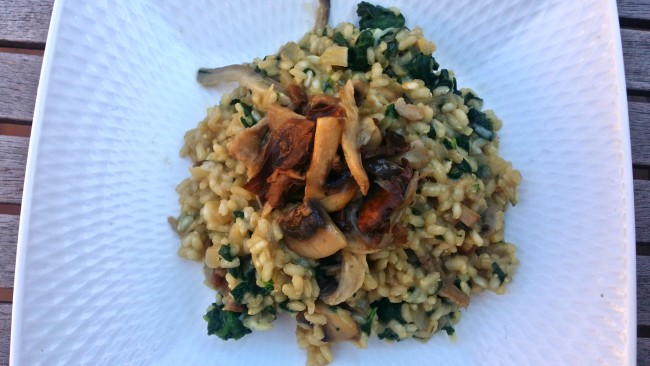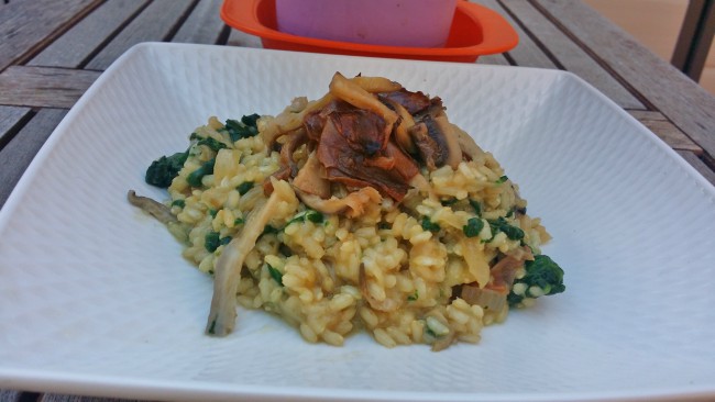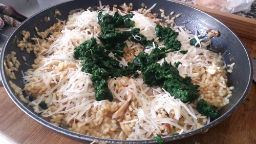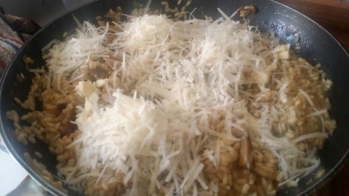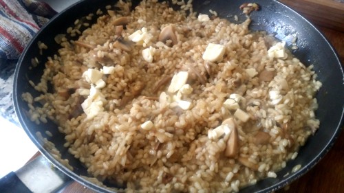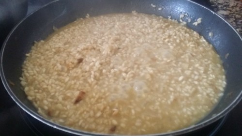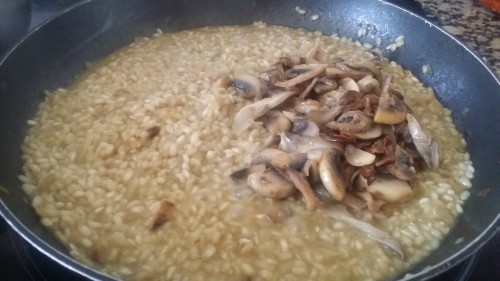 - Cuando el arroz esté blando, añadir las setas y mezclarlos (guardando algunos para la guarnición).