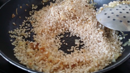 Agrega el caldo hirviendo un poco cada vez hasta que el arroz esté seco y añadir otro poco de caldo, revolviendo sobre la marcha.