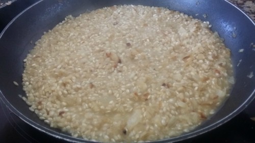 Luego agrega el vino blanco y deja que el arroz lo absorba.