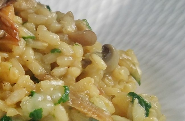 - Sirve el risotto con las setas fritas reservadas en la parte superior y cómelo de inmediato mientras la textura es suave y la arroz aún está al dente.