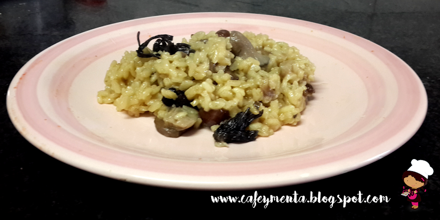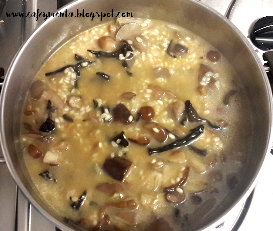 4. Cuando el caldo esté caliente, añadimos el arroz. y removemos durante un par de miutos. Entonces añadimos el vino, y dejamos reducir. Cuando haya reducido, agregamos las setas cocinadas y la cebolla dorada.