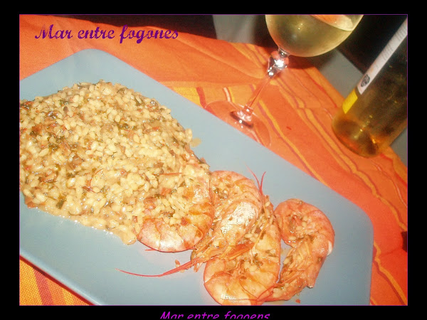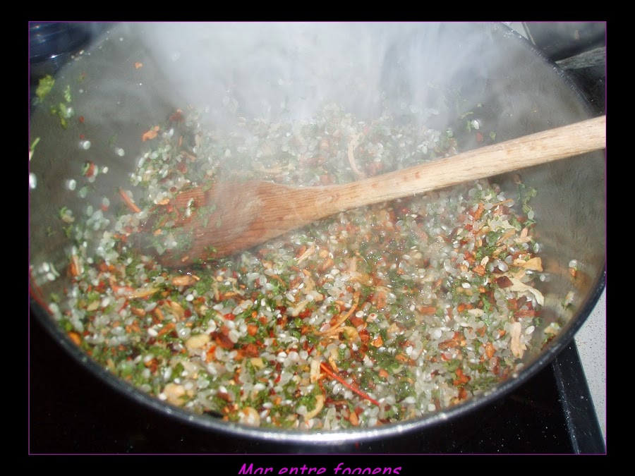 En el aceite de hacer los gambones añadimos el paquete de risotto.