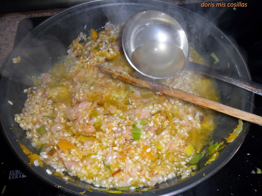 Una ver el arroz esté bien rehogado, ir agregando cucharones de caldo muy caliente poco a poco mientras se consume y va soltando el almidón.Remover constantemente en el mismo sentido y agregando caldo.