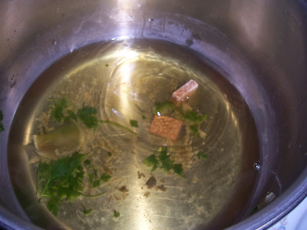 Una vez cocidas las alcachofas las apartamos y ponemos a calentar el agua de cocerlas con las pastillas de caldo y algo más de agua. O el caldo de pollo.