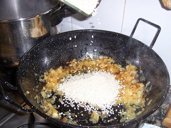 Añadimos el arroz y rehogamos durante un par de minutos, veremos como la parte exterior del arroz se queda transparente y en el centro como una bola blanca, en este momento iremos añadiendo el caldo poco a poco.
