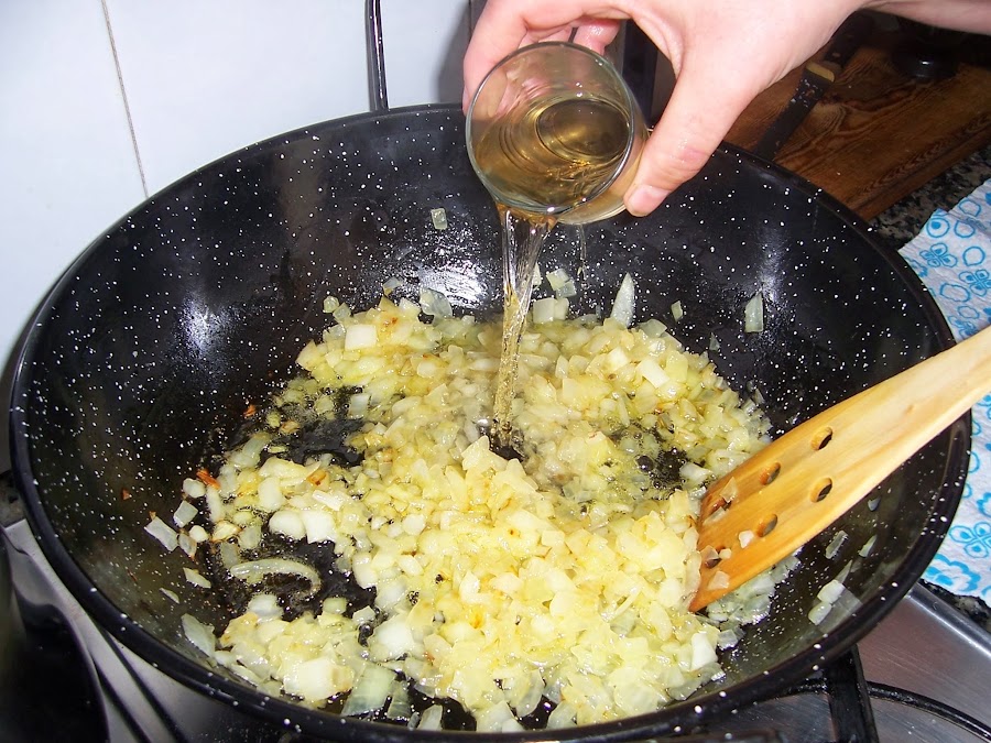 Una vez doradas las alcachofas añadimos el vino blanco y dejamos evaporar.
