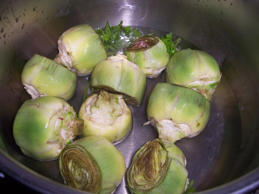 Ponemos las alcachofas a hervir con un buen puñado de sal hasta que estén blandas, yo las pongo en la olla exprés cubiertas solo hasta la mitad, 8 minutos desde que empieza a pitar.